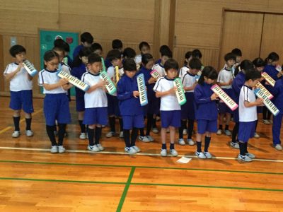 1年生はリズム楽器、2年生は鍵盤ハーモニカの2重奏で、合奏を仕上げています。
