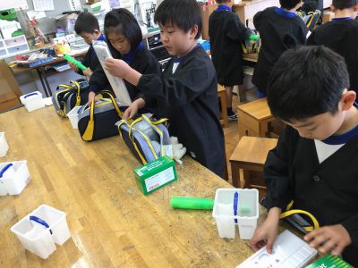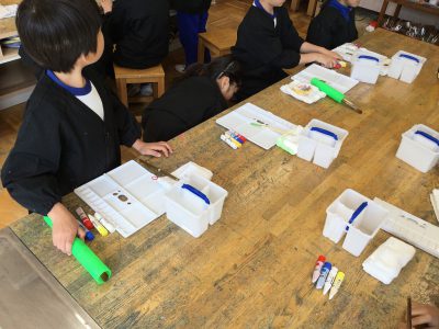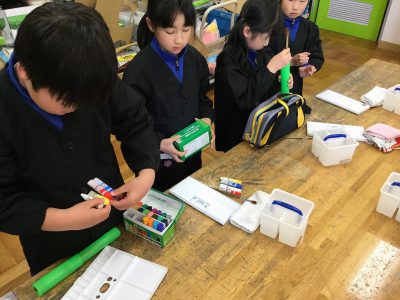 倉掛先生から、「さっ、それではしまってみましょう!」と声がかかり、みんなは、???そうです。準備と後始末がきっちりできてこそ、絵の具の学習がばっちりと進めるのですね。来週をお楽しみに!