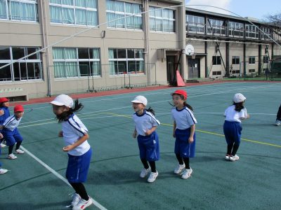 体育の大縄跳びでは、人数を増やして跳ぶ練習をしています。
