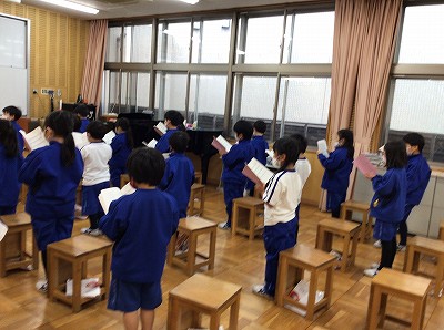 「♪花まつりのうた」を3番まで通して歌うことができるようになりました。また、発声練習の気持ちで歌った「校歌」では、息つぎの場所をよく覚えていて、言葉のつながりを考え、伸ばすところと素早く切って歌い出すところを使い分けています。