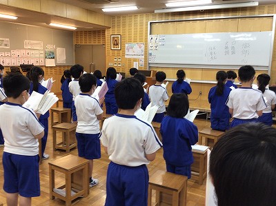 3番までの歌詞を音読した後に、歌詞の意味を伝えました。まわりへの感謝の気持ちと、仏様のお誕生をみんなが喜んでいる気持ちで歌えるように、ゆっくりとしたテンポで歌う練習をしました。