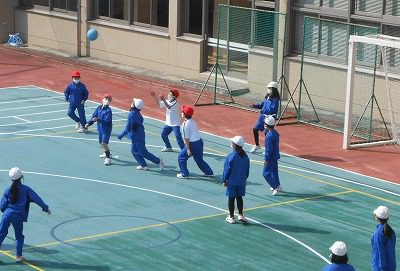 中間休みは、外に出てみんなでドッジボールをしていました。