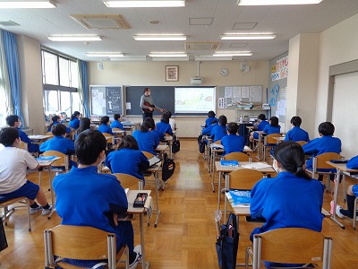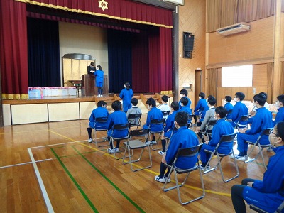 体育館に行く前に、太鼓の叩くときの衣装である法被と帯を教室で渡しました。