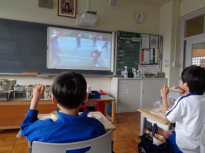 その時の様子を一部録画して、給食中にみんなで見ました。みんなの躍動ぶりがあらためて伝わってきます。