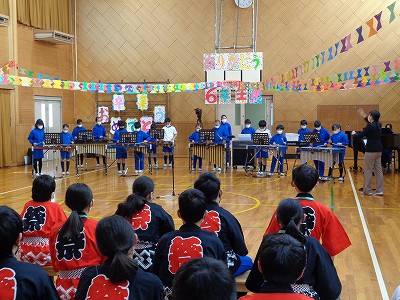 体育館に移動して、いよいよ4年生の発表です。4年生は、6年生に向けて「夏祭り」の合奏を贈ります!テンポがついつい速くなってしまうことが課題でしたが、力を合わせて音を聞き合いながら、最後まで演奏することができました。