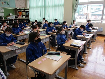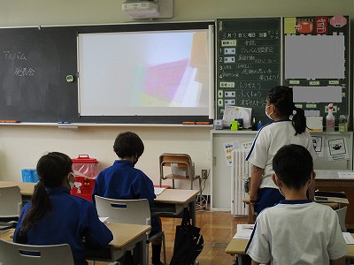 1,2年生の発表が終わって体育館から教室にもどった後は、Live中継で『6年生ありがとうの会』に参加しました。子どもたちは、会場にいるかのように、発表が終わるごとに拍手をしていました。
