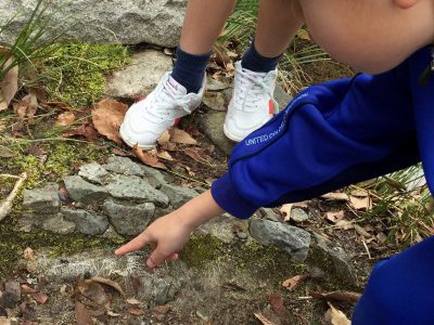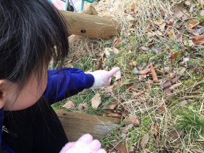 よく見ると、どんぐりの傘のところが真っ黒になっていたり、ダンゴムシの赤ちゃんがちぢこまっている生き物を見つけたり、毛むくじゃらの茎を探してきたりと、冬から春への変わり目に気づくひとときを過ごしました。
