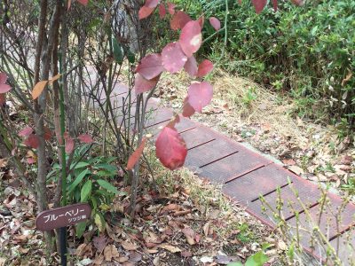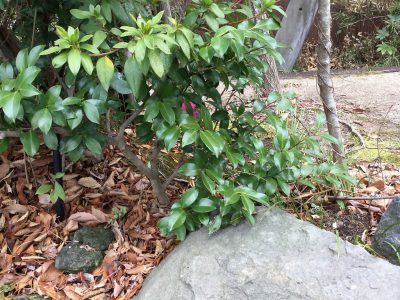 「こっちこっち~」と呼んでくれたところには、“つばき”の濃いピンクのお花が一輪だけ残っていました。