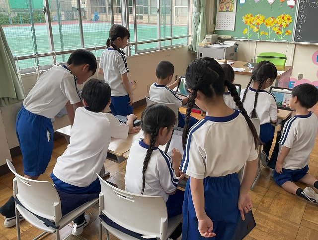 案内が終わった後は、1年生の教室で電子書籍を紹介しながら、おすすめの本を一緒に読んだり、1年生に好きなお話を聞いたりしながら楽しいひとときを過ごしました。