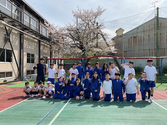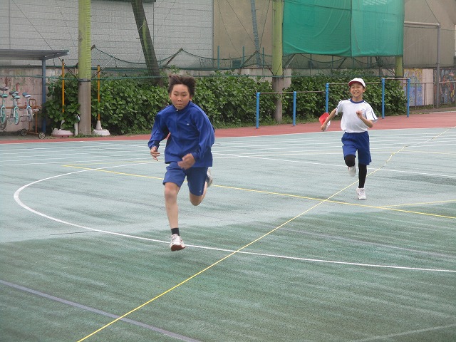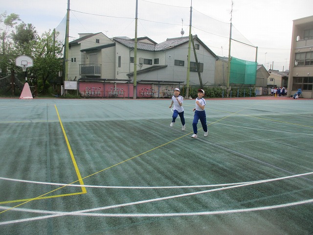 走っている友達に対して、「がんばれ!」「ファイトー」と、自然に応援する声がグラウンドに響いています。爽やかな汗をかきながら体育の活動を楽しみました。