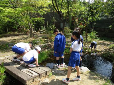 ビオトープ「はっちの杜」では、池の中に何かの生き物を発見!