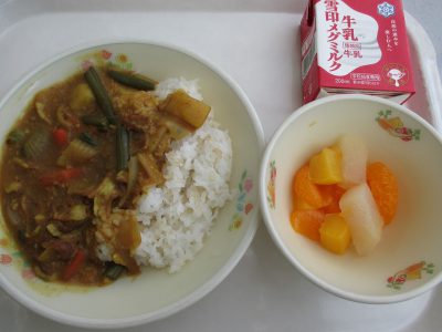 今日の給食は「ポークカレー、フルーツカクテル」でした。