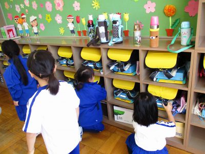 ランドセルは、向きをそろえて、奥までしっかり入れています。