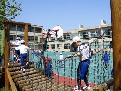 中間休みは、みんなでビオトープの丸木橋に行きました。
