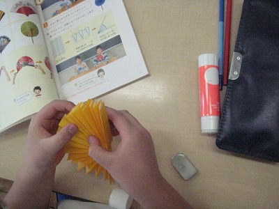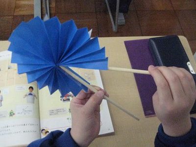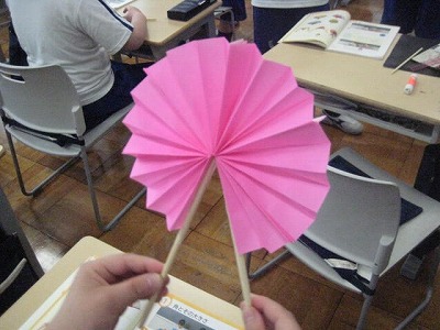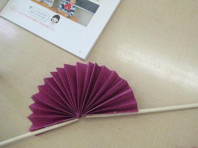 今日は、折り紙と割り箸を使って「扇」を作りました。