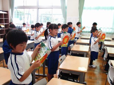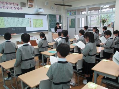 国語の時間は、まず、『あさ』という詩の音読をしました。