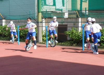 6年生にとっては、久しぶりの一輪車です。身体の成長もあり、「乗れていたのに乗れなくなった!」という声もありました。身体が成長して大きくなると、バランスを取ることも難しくなってきます。「姿勢」と「とにかく漕ぎ続けること」をポイントに、みんな果敢にチャレンジしていました。