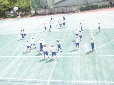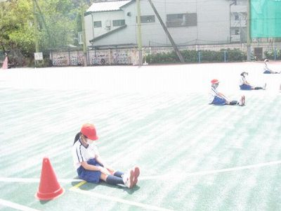 途中で水分補給と休憩の時間を入れながら、変形ダッシュや一輪車、大縄跳びをしました。