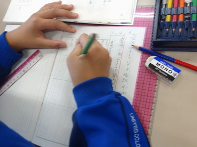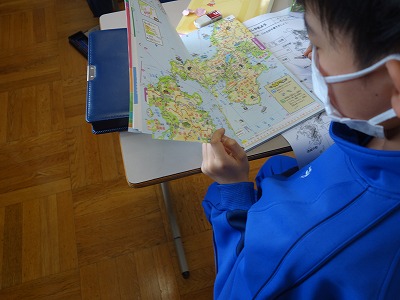 授業のはじめに、日本の主な地理の名前が教科書にも出てきます。これを何度も繰り返して覚えることを目指して、今日は地図帳を見ながらワークシートに書き込んでいきました。