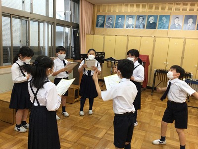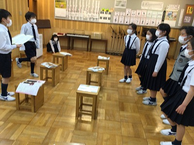 早口言葉の定番「生麦生米・・・」「東京特許・・・」「かえるぴょこぴょこ・・・」を重ねたり、かけ合ったりして、拍にのせて発声する活動を楽しみました。
