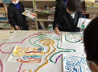絵の具の線が重ならないように、筆の力加減を考えながら、ゆっくり安全運転で線を描いていきます。