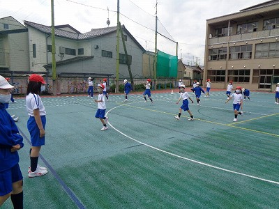 体育の時間は、50メートル走を行いました。体ほぐしの運動として、スキップやサイドステップ、短いダッシュや後ろ向きのダッシュなど、いろいろな体の使い方をしながら、ウォーミングアップです。腕をしっかりふること、まっすぐ走ること、リズムよく走ることなど、速く走るポイントをおさえながら全力を出し切りました。