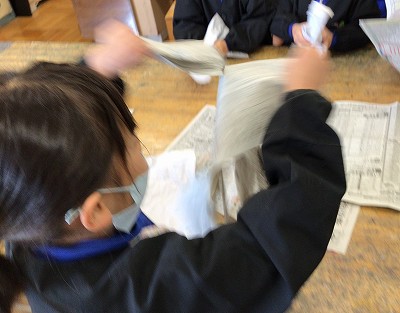 封筒と新聞紙を「ぐしゃぐしゃ」ともんで柔らかくして枕をつくります。