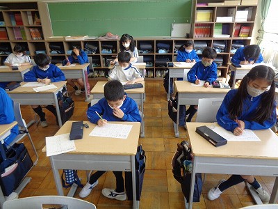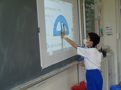 算数は、「角とその大きさ」について学習しました。1時間目の単元目標は、「いろいろな角を工夫してはかろう」です。分度器の使い方をマスターした4年生。今度は、短い線の角や、大きい角を工夫してはかる練習をしました。学習を通して、どのくらいで約何度くらいという感覚も身につけることができました。