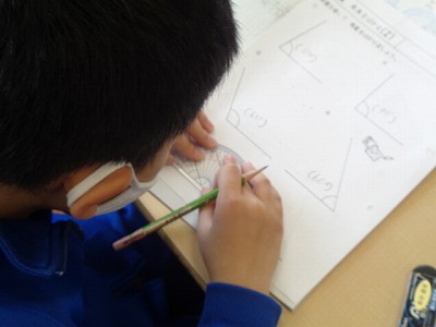 その後は、練習プリントを使って、いろいろな角の問題に挑戦します。どの部分を合わせれば、正確にはかることができるのかをつかみ、だんだんと上手にはかれるようになってきました。