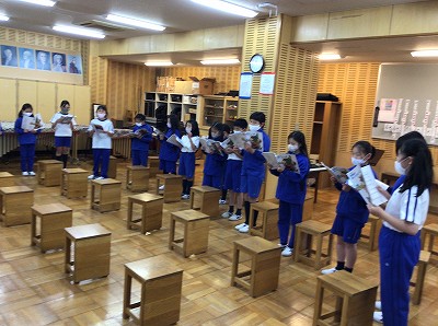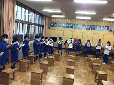同じフレーズの部分と2つの音が広がる部分がはっきりしていて、響き合おうとしていました。どちらのパートも気持ちよく歌えることがポイントです。次の時間は、レベルアップを目指します。