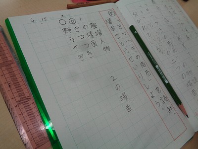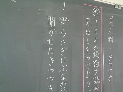 国語科「きつつきの商売」の学習です。今日は、きつつきの商売のお話を読み、登場人物や見出しを考えました。