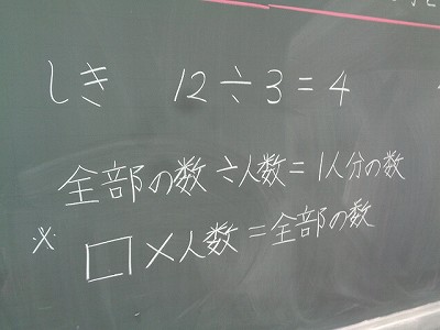 「一人分の数の3つ分が12こになるから」と考えて、一人分の数を求めました。