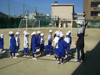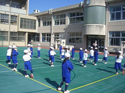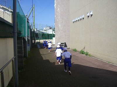 準備体操をして、小学校横の通路を通って、中学・高等学校グラウンドに移動します。