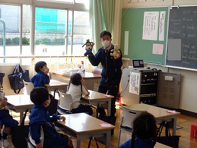 "What's your name?" "I'm Pooh." 楽しい自己紹介の様子です。子ども達も自分のことを紹介できました。