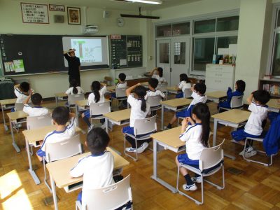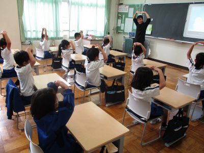 明日の天気予報は「曇りのち雨」と確認した後、[♪Rain Rain Go Away]を歌ったり、[Summer]を、ジェスチャーで表現して、英語を楽しんでいました。
