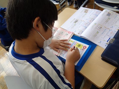 書き順、読み方を確認し、一字一字丁寧に書き進めていました。