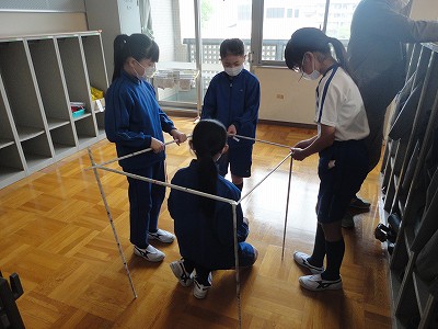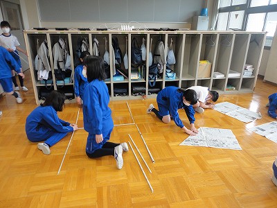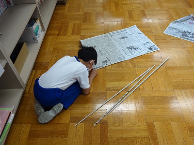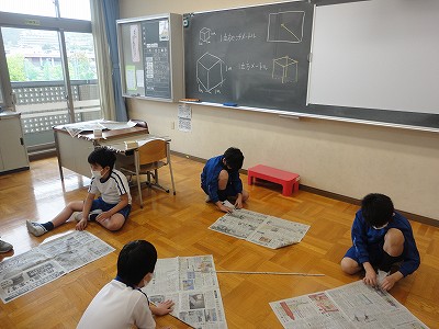 1校時の算数は、体積の学習で登場する「1㎥」を新聞紙でつくることを通して、その量感をとらえる学習です。「1立方メートル」を体感するために、「" ほぼ " 1立方メートル」を作りました。