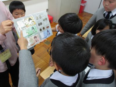 韓国のお金を見せて頂きました。 一万ウォンの紙幣から、ハングル文字を作った世宗大王のことを知りました。 「ぼく、もう覚えた!」という、元気な声が聞こえました!