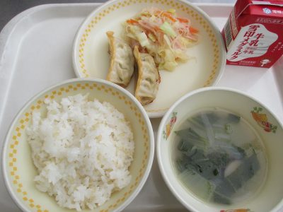 今日の献立は「ぎょうざ、春雨サラダ、チンゲン菜の中華スープ」でした。