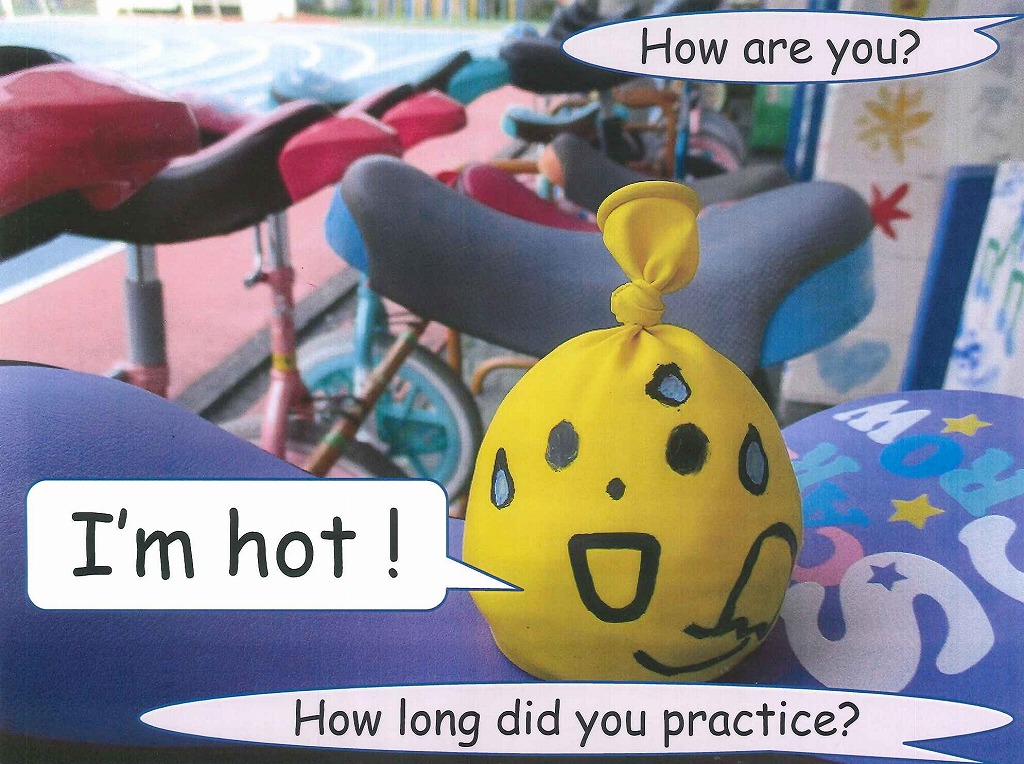 一輪車を練習していて、汗いっぱいのバルーンちゃん。“I am hot.”