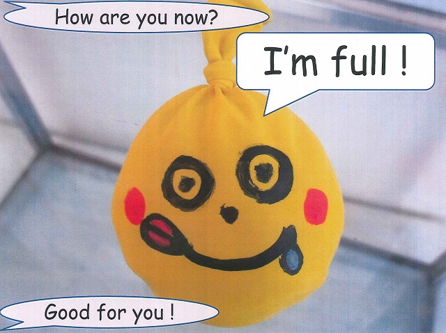 「おなか いっぱい!」 “I am full.” 満腹のバルーン君。あらまぁ!