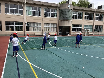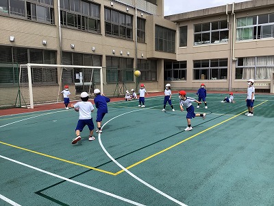 内科検診のため、休み時間が無くなったので、体育の時間に休み時間をとったところ、みんなでダブルドッジを始めました。