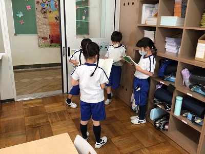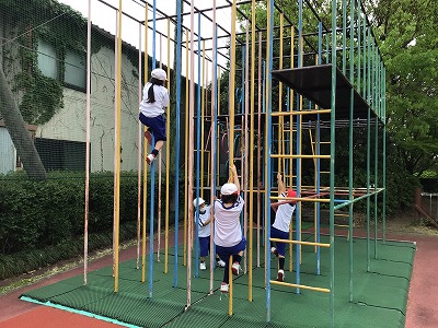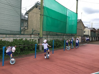 一旦水分補給をした後、体育を始めました。準備体操の後、のぼり棒チャレンジ、続いて総合遊具チームと一輪車チームに分かれて、それぞれの運動を楽しみました。