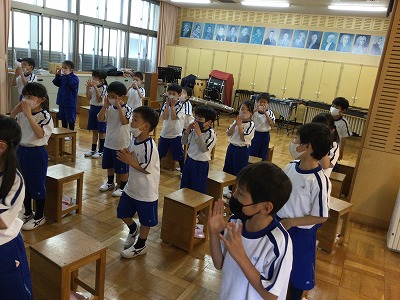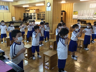 音楽の時間に、振り付けならぬ体操をみんなで考えて、くり返し練習しました。