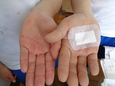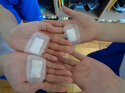 「先生~、マメがつぶれた~。」といいながら保健室へ。「痛かったなあ。頑張った証拠、証拠!」と言って励ましています。