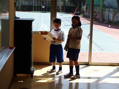 まずは、学級代表の2人が「はじめの言葉」と「約束事」を1年生に伝えることからスタートしました。