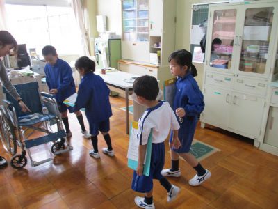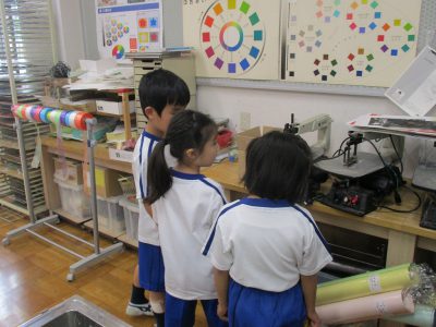 2年生のお兄さん・お姉さんから、教室の名前や、教室の特徴を聞きながら、校内を回りました。