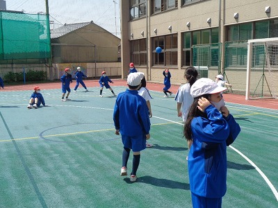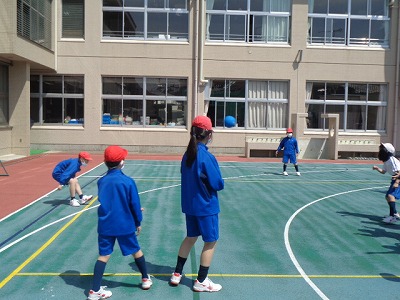 中間休みは、ボールを使ってドッジボールです!今日はお天気も快晴で、クラスの多くが外遊びをしていました!