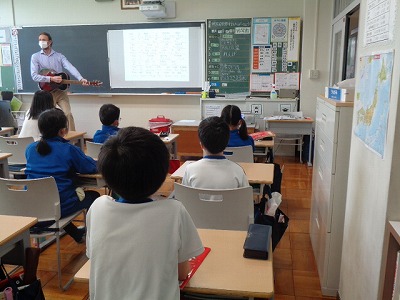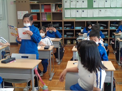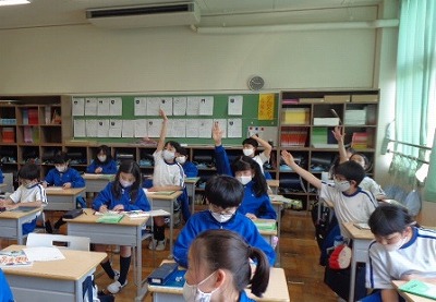 “にっぽんの歌”というコーナーで「♪さくらさくら」が紹介されています。今日は、この曲との出会いからスタートです。“見渡す限り”と歌詞にもあるように、日本を代表する桜をイメージした「日本古謡」を、4年生はやさしくゆったりと歌っていました。