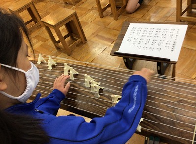 いよいよ順番が回ってきました。漢字で表され、しかも縦向きの楽譜を見ながらの挑戦です。弦を響かせ、集中して向き合っていました。